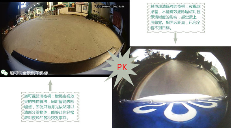 供證據(jù),行車記錄等于白裝了。而道可視360度全景擁有四路超清攝像頭,每個(gè)攝像頭都擴(kuò)大了通光的光圈,在夜晚能夠捕獲更清晰圖像。在微弱星光下,利用增