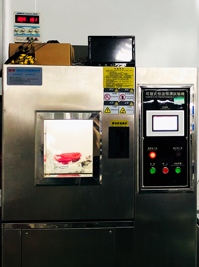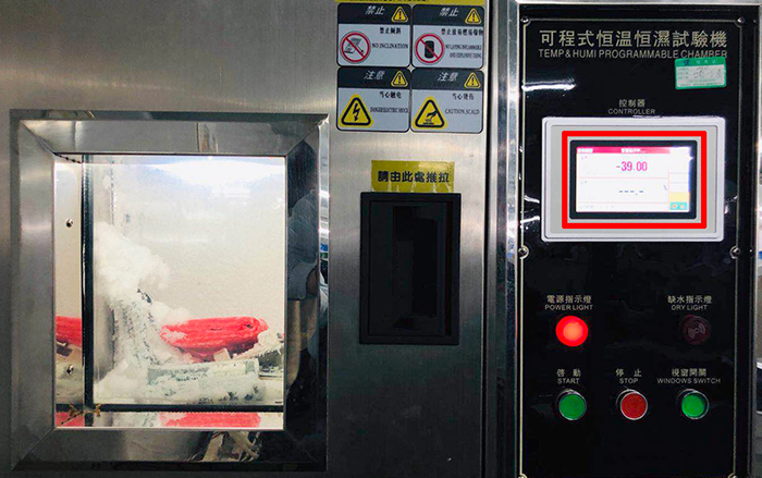 在道可視生產(chǎn)線眾多高科技的檢測工具中,不得不提可程式恒溫恒濕測試機(jī)。這臺機(jī)器24個小時全程處于開機(jī)狀態(tài),可以對機(jī)器的高低溫和耐濕度進(jìn)行測試。在下圖中,道可視360°全景行車輔助系統(tǒng)的幾塊主板已經(jīng)放進(jìn)了機(jī)器進(jìn)行了幾天時間的測試,溫度設(shè)置在了﹣40℃,在如此惡劣的低溫條件下,測試機(jī)內(nèi)已經(jīng)結(jié)滿了冰霜,但道可視的主板卻依舊“頑強(qiáng)”的亮燈工作著。