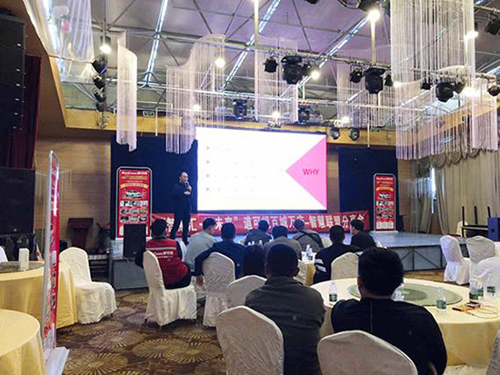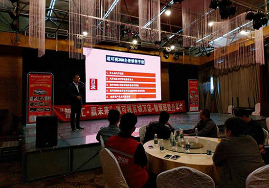 道可視代理商鄭州云游汽車銷售有限公司趙總率先進行道可視智慧聯(lián)盟店政策的主題講演,他表示,2019年道可視將在全國各省地級市舉辦多場招商會,共建立超4000家智慧聯(lián)盟店,他從門店產(chǎn)品的售前準備、售中執(zhí)行、售后服務(wù)三個層面進行了更細致化的闡述。