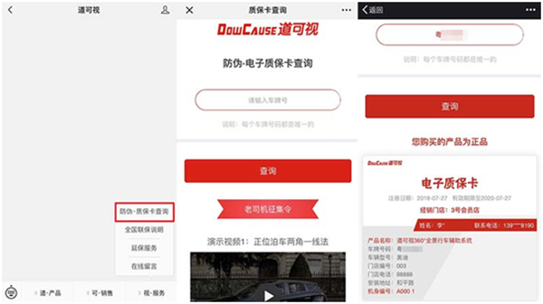 通過電子質(zhì)???,用戶可以免費(fèi)享受2年的質(zhì)保和全國聯(lián)保服務(wù);可以隨時(shí)查詢產(chǎn)品的售后期限和相關(guān)售后政策;可以查詢到道可視分布全國的銷售網(wǎng)絡(luò);可以查詢到所在城市、地區(qū)的全國聯(lián)保門店,方便就近選擇售后門店;可以在線聯(lián)系官方客服,預(yù)約售后時(shí)間和地點(diǎn)。