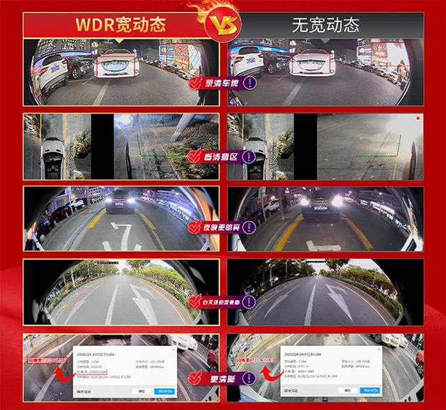 道可視4顆攝像頭均植入WDR算法,在白天或是夜間復(fù)雜強(qiáng)光環(huán)境下,有效抑制強(qiáng)光,解決夜間強(qiáng)光環(huán)境下的炫光問題,避免汽車大燈照射下造成影像顯示,以及影像記錄“一團(tuán)白色”的尷尬,能夠清晰的記錄及看清車牌和路況。